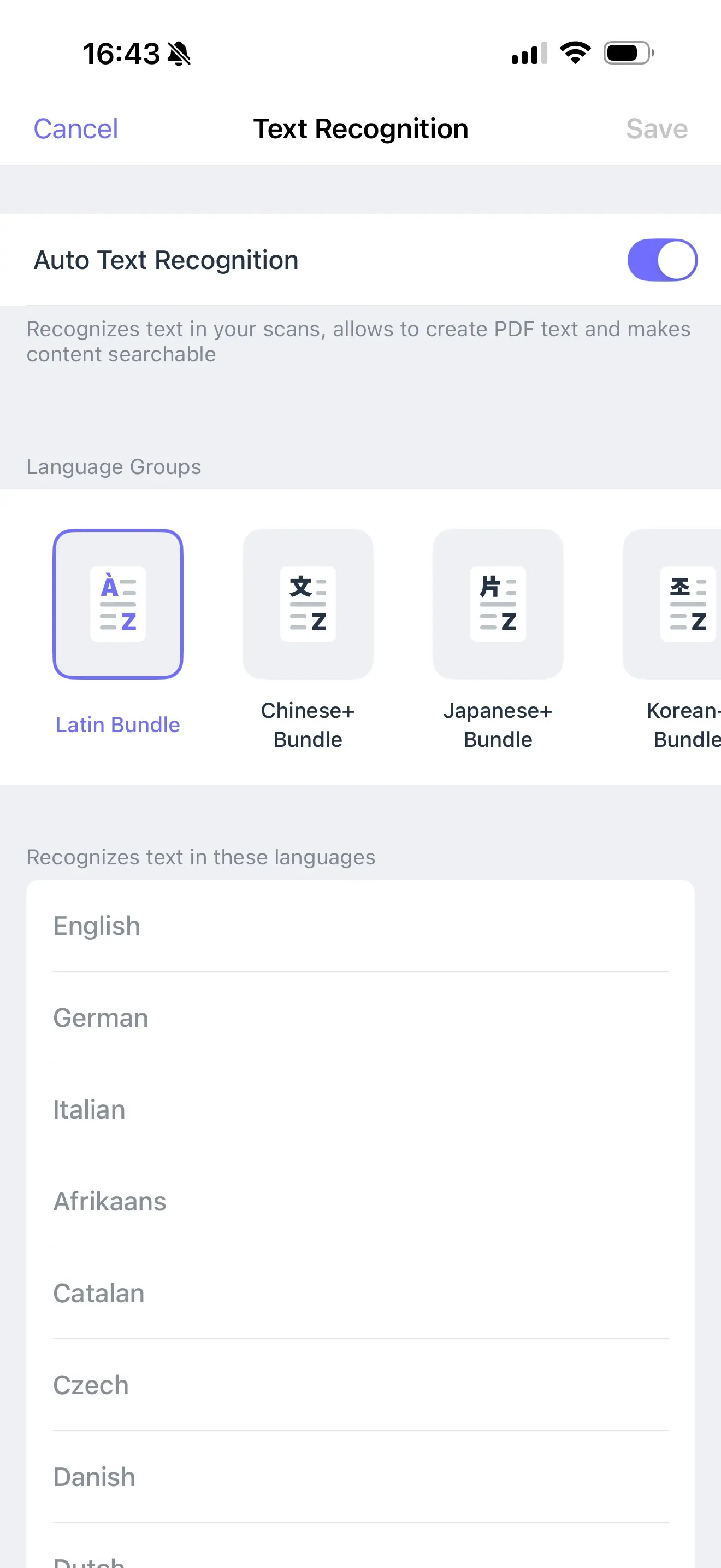 Sobald du gespeichert hast, verwendet Scanner Pro diese Sprachgruppe, um alle neuen Scans zu verarbeiten, bis du die Einstellung wieder änderst.