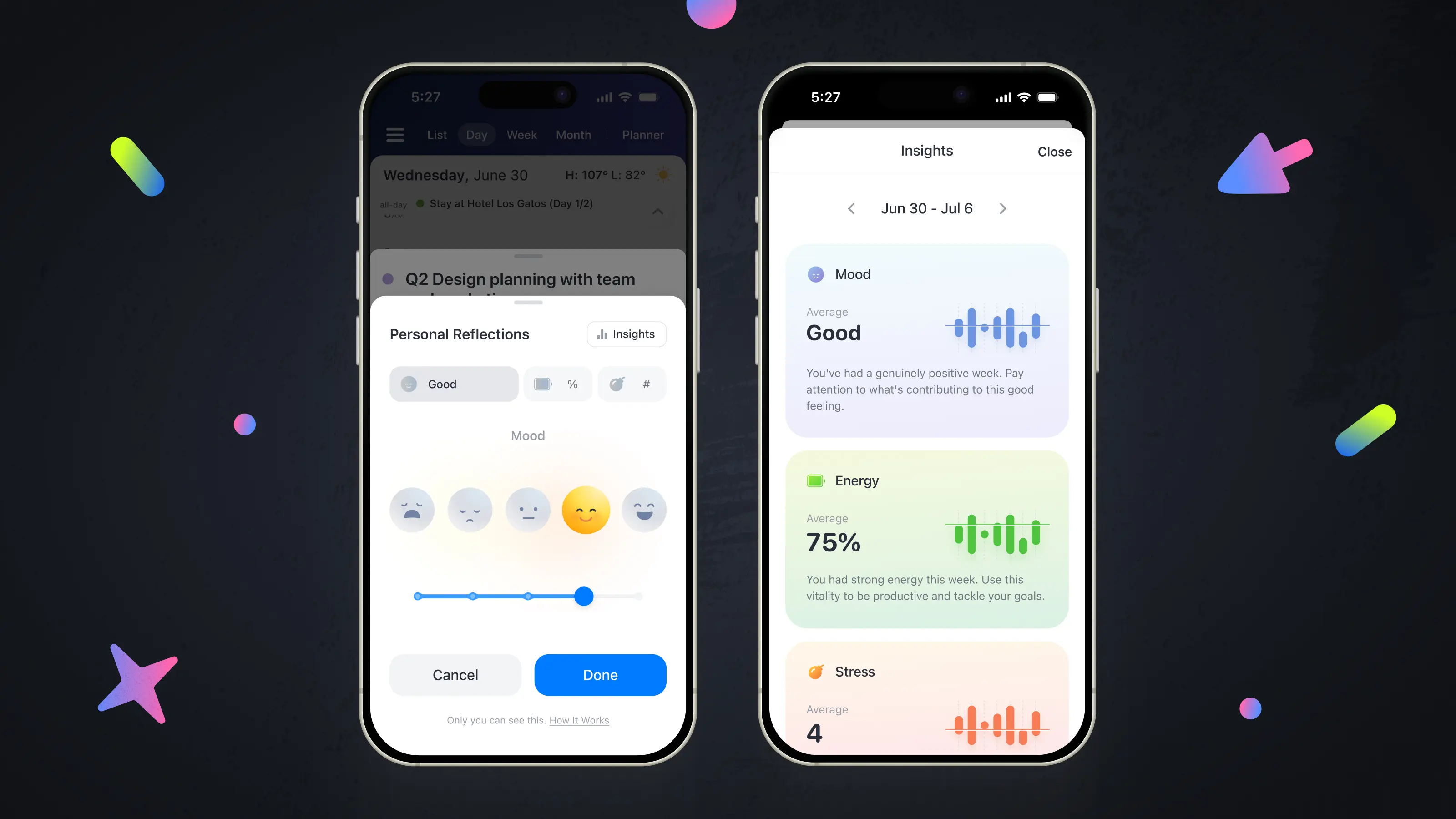 La productividad consciente no se trata solo de hacer: se trata de notar. Personal Reflections te permite registrar tu estado de ánimo, tu energía y tu estrés junto con tus tareas y eventos. Con el tiempo, verás patrones que revelan qué te impulsa, qué te drena y cómo planificar días que realmente funcionen para ti. ¿Y lo mejor de todo? Toda esta información es privada y es totalmente tuya, así que puedes ser honesto/a sin preocuparte por los juicios.