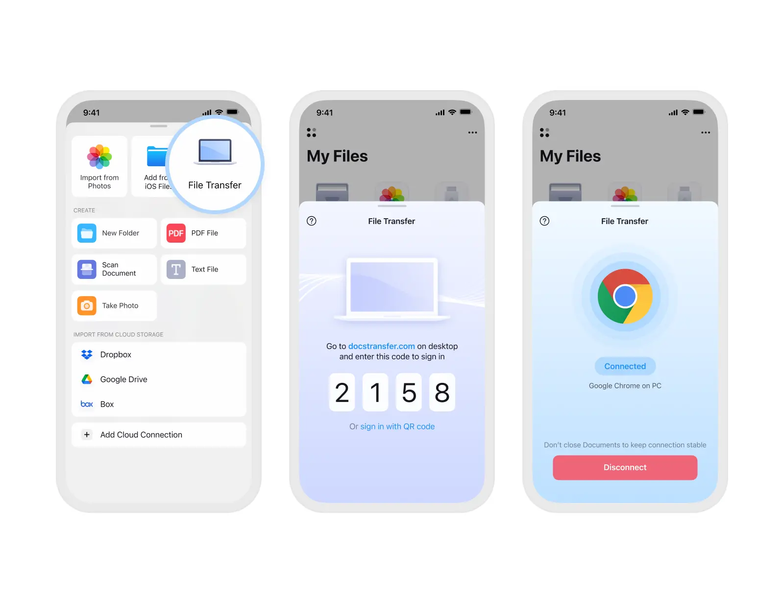 Vous pouvez ouvrir docstransfer.com dans n'importe quel navigateur. Il fonctionne sur Mac, Windows et même Android. Tout ce dont vous avez besoin, c'est de votre iPhone ou iPad avec l'application Documents installée.