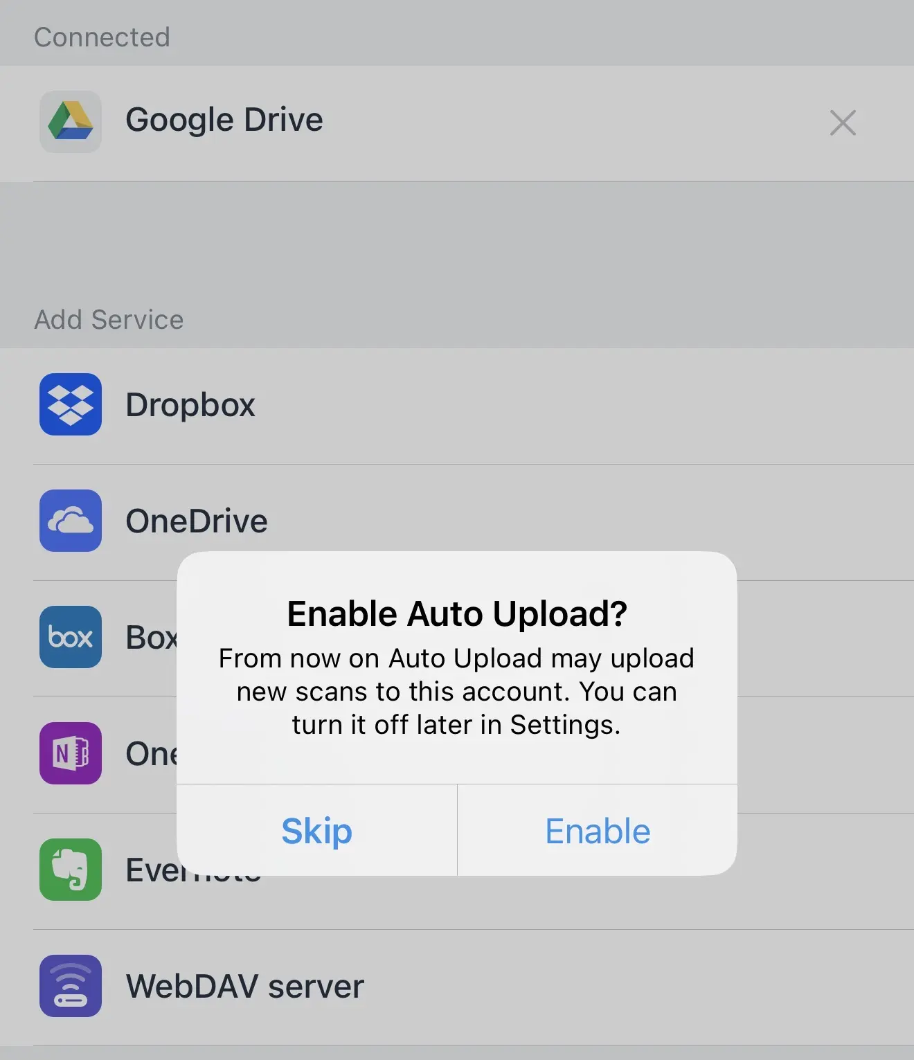 之后系统会提示你开启自动上传。 此功能会自动将你所有新的扫描件保存到云端。 如果你想使用此选项,点击“启用”;如果你更希望手动上传文件,则点击“跳过”。
